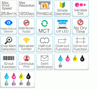 [UCJV300 Series] is a versatile inkjet printer having a combined function of both printing and cutting mounted with UV-curable ink.